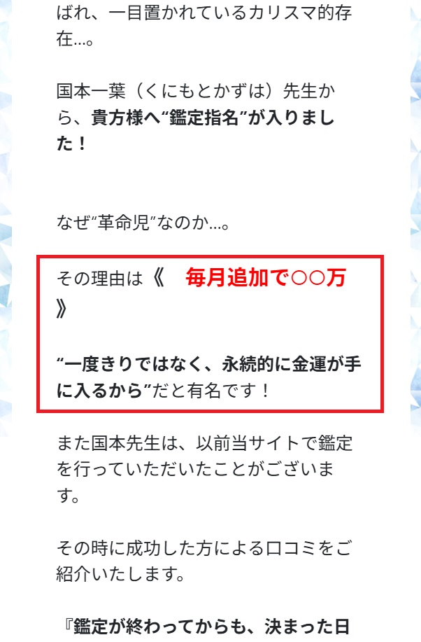 統括の福富 栄二は、国本 一葉という鑑定師が、「毎月追加で○○万」「一度きりではなく、永続的に金運が手に入る」という有名な占い師であるかのようなメッセージを送っていました。