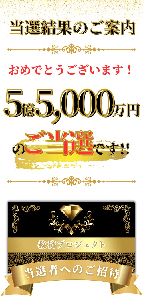 この度、救済プロジェクトより見事お客様へ5億5000万円が当選しご連絡を差し上げました。
