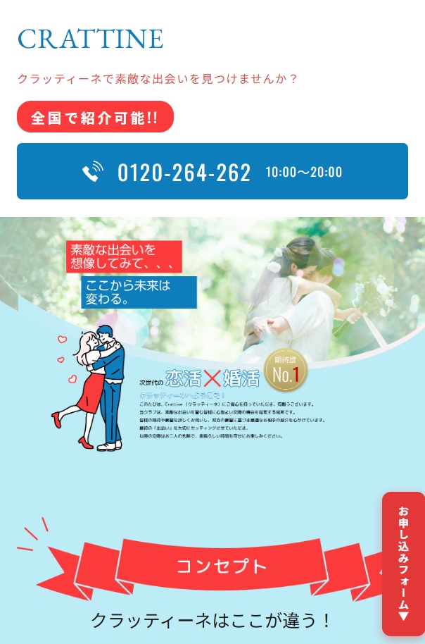 ↑のメールのURLは、Crattine(クラッティーネ)という交際・デートをする相手に出会えるサービスの設定になっているサイトにつながるようになっていました。サイトには、「専任のコンシェルジュが理想のお相手とマッチングさせ、最高のデートをセッティングいたします。」などと書いてありました。