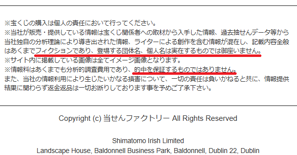 当せんファクトリーは、専属アドバイザーがAIで作成したナンバーズの番号の情報を販売しているサイトのケースが分析できましたが、内容はすべてフィクションで、的中を保証するものではありませんという説明が書いてあります。