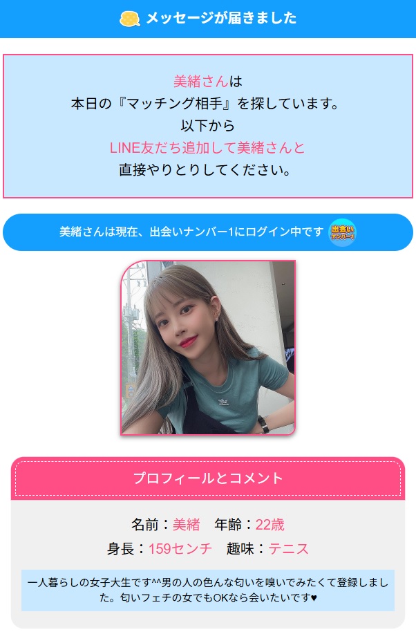 ここは、↓のサクラプロフィールで誘導しているケースがあった悪質サイトでした。